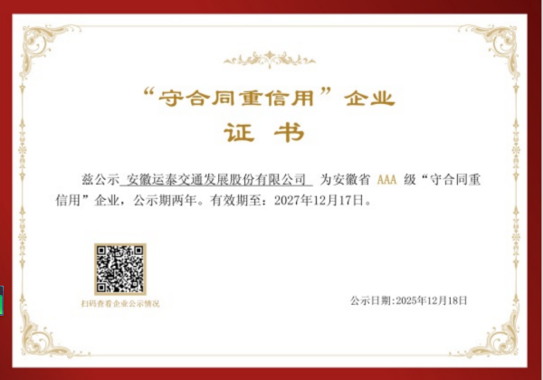 日前,安徽省市场监督管理局公示2026-2027年度“安徽省守合同重信用”AAA级企业名单,安徽运泰交通发展股份有限公司位列其中。