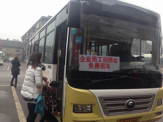 2月23日至26日,农历正月初五至初八,主题为“就业帮扶、真情相助”的2015年春节广德企业用工大型招聘会在县人力资源市场举行。为方便参加招聘会的人员往返乘车,广德城乡公交公司为此提供了免费班车。该公司特意在招聘会期间抽调了部分公交车,分别从大润发和太极商场至县人力资源市场开通循环班车,为求职者出行提供便利。(沈州 刘小青 文/摄)