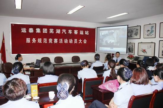 5月13日下午,运泰集团芜湖汽车客运站召开“集团第三届服务规范竞赛活动”动员大会并开展培训,副站长王栋主持。 会议组织学习了集团公司第三届服务规范竞赛活动方案,会议要求广泛宣传竞赛活动,使全体一线员工了解本次竞赛活动的目的和意义,充分调动广大员工的积极性,增强岗位规范服务意识,不断提高优质服务水平。在随后的培训环节中通过视频演示、案例分析等形式,按照竞赛要求,在仪容仪表、规范用语、服务流程等方面对站务员进行了培训。(吴乐鹏 文/摄)