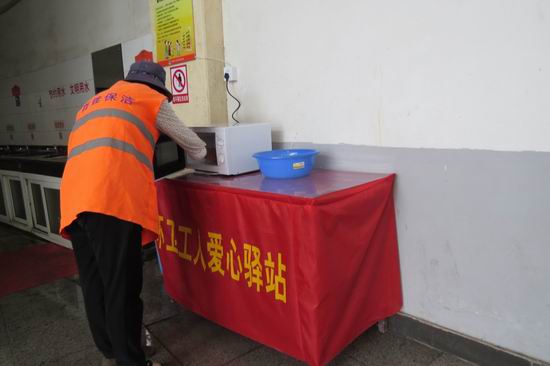 近日,繁昌县运通公司在客运中心候车大厅内设立“环卫工人爱心驿站”。驿站里配有休息坐骑、洗漱用品、微波炉、一次性纸杯和便民服务箱等设施。提供热开水,可加热饭菜,方便了环卫工人临时休息。爱心驿站的设立,受到环卫工人和群众的好评,体现了运通公司勇于承担社会责任。(韩忠荣 文/摄)