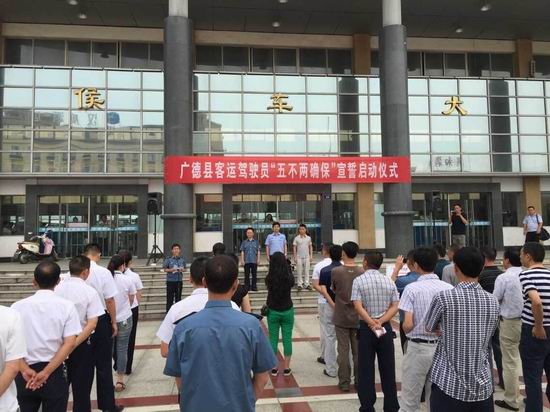 为进一步强化客运驾驶员安全意识和职业责任感,自觉把保护乘客生命安全作为职业的最高职责,7月3日上午,广德县开展客运驾驶员“五不两确保”安全承诺宣誓活动。活动现场,广德城乡公交公司席善星代表全县驾驶员宣誓,在驾驶过程中做到“不超速、不超员、不疲劳驾驶、不接打手机、不关闭动态监控系统,确保乘客系好安全带、确保乘客生命安全”。(李红芳 李浩 文/摄)