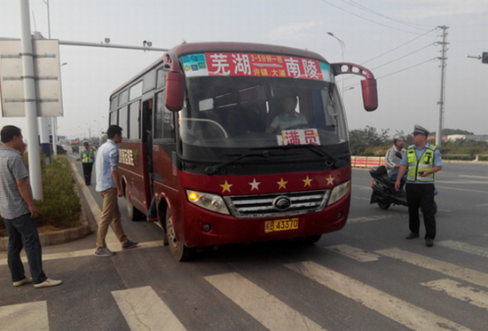 在中秋佳节和“十一”黄金周来临前夕,9月21日,运山公司联合芜湖弋江交警大队火龙岗中队在芜湖南治超点,对芜南线班车超员及驾驶员有无系安全带等行为进行检查,并劝导车上乘客系好安全带,确保行车安全。(吴笑华 文/摄)