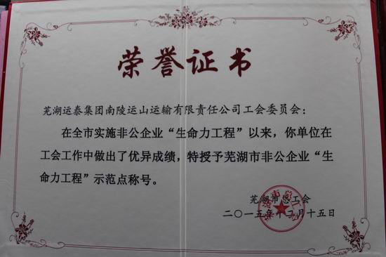 日前,在市总工会开展的全市非公企业“生命力工程”选树活动表彰会上,芜湖运泰集团南陵运山公司工会被授予市非公企业“生命力工程”示范点荣誉称号。(徐国庆 文/摄)