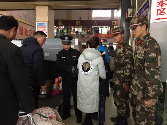 随着春运客流高峰的来到,芜湖汽车站邀请武警战士驻站,协助车站工作人员维护站区秩序,保障旅客的出行安全。(张莹 文/摄)