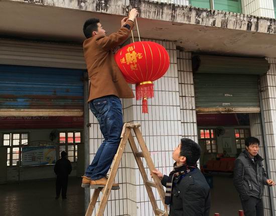 2月6日,为了迎接猴年春节的到来,广德城乡公交公司员工自己动手在候车厅外挂起了寓意团圆喜庆的大红灯笼,为每辆公交车贴上了对联,一盏盏象征着吉祥如意的大红灯笼和火红的春联,让人们感受到浓郁的节日气氛。(梁金 文/摄)