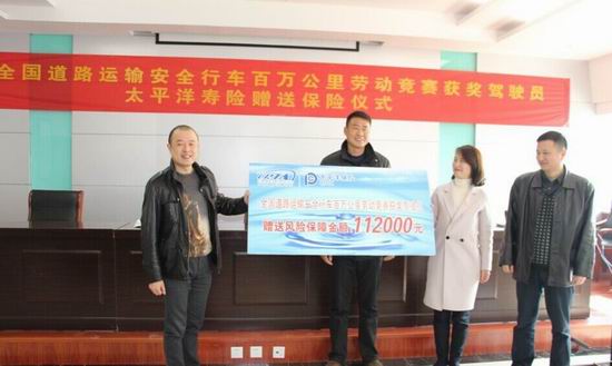 3月2日上午,中国太平洋人寿保险公司芜湖中心支公司在南陵运山公司会议室,为在首届全国道路运输安全行车百万公里驾驶员劳动竞赛活动中被评为全国先进驾驶员的徐龙赠送保险。集团公司客运事业部总经理助理王胜、运山公司经理吴军和集团各客运分公司相关人员参加此次活动。赠送仪式上,中国太平洋人寿保险公司芜湖中心支公司总经理李芳向徐龙赠送了总额为112000元的意外险。(明园园 徐国庆 文/摄)