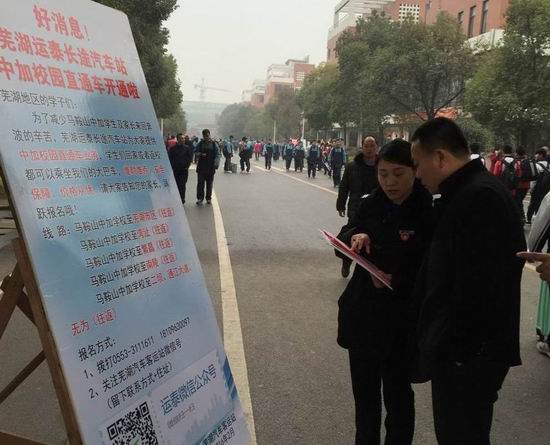 马鞍山中加双语学校是一所民办寄宿制中学,设有初中、高中两个学部,学校现有150个教学班,在校生9300余人,其中有千余人来自芜湖。对这一潜在的商机,芜湖汽车站积极联系校方,在该校校门口、校内和学生宿舍等处通过设置广告宣传牌、安排专人现场讲解、发放宣传单等方式向学生、家长进行宣传并详细做好学生和家长的信息登记。该站正积极开展筹备工作,芜湖至马鞍山中加学校直通车拟在本月开通,直通车将在学生放假以及返校期间接送学生往返。(吴乐鹏 王栋 文/摄)