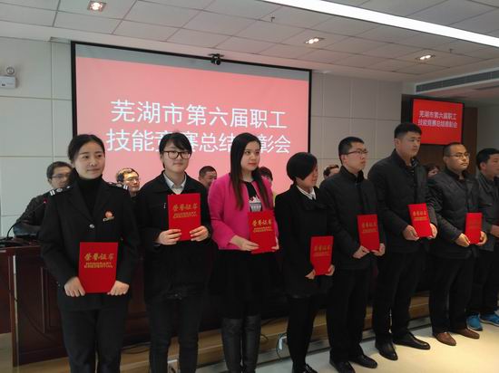 3月15日,在第六届全市职工技能竞赛表彰大会上,芜湖客运公司乘务员赵春燕和芜湖客运站站务员罗璇获得芜湖市第六届职工技能竞赛(客运服务大赛)乘务员组和站务员组第一名,分别被授予“芜湖市技术状元”称号。(梁邦新 文/摄)