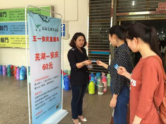 近日,运泰集团芜湖汽车客运站营销团队前往安师大、安徽工程大学、皖南医学院、芜湖职业技术学院等高校开展五一小长假“校园直通车”宣传工作。 为提高校园直通车在学生群体中的知晓率,该站通过设置宣传展板、发放宣传单等方式进行宣传,并安排人员现场提供咨询服务,详细登记乘客信息。本次直通车重点宣传的安庆班线票价设置低于站务售票和高铁票,此举旨在把握小长假契机,给学生群体以实惠,吸引更多客源。(吴乐鹏 王栋 文/摄)