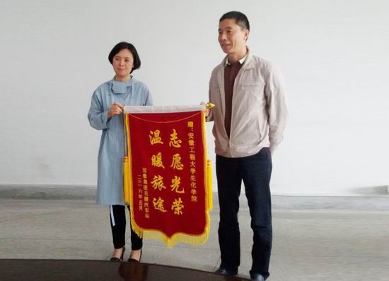 5月9日下午,运泰集团芜湖汽车站支部书记等一行来到安徽工程大学,将一面书有“志愿光荣、温暖旅途”的锦旗送给该校志愿者团队,对他们表示感谢。 多年来,每逢重大节假日,安徽工程大学志愿者自发来到芜湖汽车站,协助为旅客提供志愿服务,弘扬志愿服务精神。在赠旗现场,双方表示今后将不断加强合作,更好地服务广大乘客。(吴乐鹏 文/摄)