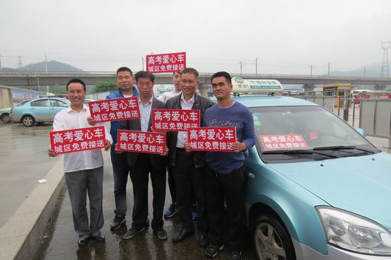 一年一度高考6月7日开始,为了帮助广大考生安全、快捷、准时抵达考场,繁昌公司继续组织爱心高考免费接送志愿服务。该公司开通城区至各考点免费公交专线,所属约100辆岀租车悬挂红丝带标志,免费接送考生。为方便特殊困难考生,该公司还提供预约服务,接受紧急求助,考生可提前拨打出租车公司电话预约,为考生和家长开通了一条快捷的绿色通道。