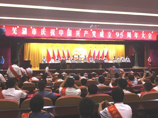 6月30日上午,在中共芜湖市委召开的“庆祝中国共产党成立95周年大会”上,运泰集团芜湖汽车站党支部被授予芜湖市“先进基层党组织”荣誉称号。(张莹 文/摄)