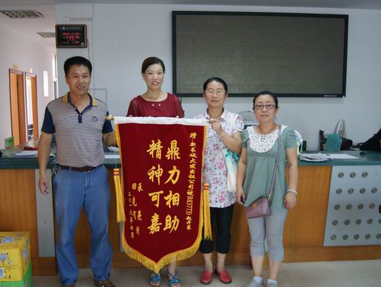 7月25日下午,几位市民来到新长城出租车公司,向助人为乐的好司机赵开翠送来锦旗。 原来,7月22日凌晨2点,赵开翠师傅行驶在三山区时发现一位70多岁的老奶奶迷路。经再三询问,得知老人家住镜湖区皖医老校区附近,一早上胜利渠买菜后迷失方向,一路走到三山区。当时已是深夜,还下着小雨,老人一天滴水未进。赵开翠连忙联系上老人的子女,将老人安全送到家。(杨天 文/摄)