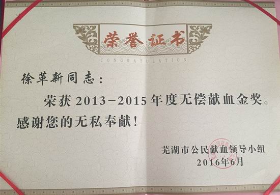 日前,安徽运泰芜湖汽车站员工徐革新同志荣获“2013-2015年度芜湖市无偿献血金奖”。 徐革新同志10多年来一直坚持无偿献血,累计献血总量已达7000亳升,此前他曾在2012年获得“2009—2010年度芜湖市无偿献血奉献奖银奖”。获奖后徐革新同志表示,只要身体条件允许,他还要将无偿献血这项爱心事业继续下去。(张莹 文/摄)