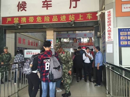 国庆假日期间,为保障旅客出行安全,驻地武警战士担负起安徽运泰芜湖汽车站安全保卫任务。武警官兵协助车站安检人员维持秩序、帮助旅客搬运行李,为旅客出行保驾护航。(张莹 文/摄)