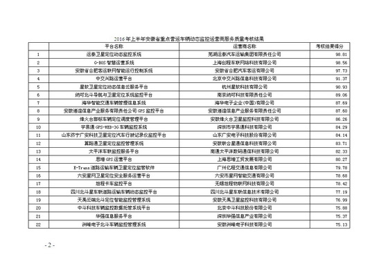 根据《安徽省重点营运车辆动态监控运营商服务质量考核管理办法》,省交通运输厅日前公布今年上半年省重点营运车辆动态监控运营商服务质量考核结果,安徽运泰排名全省第一。本次参加考核的全省动态监控运营商平台共34家,考核从平台断线率、数据链路、车辆数据质量等6大类34项指标进行现场测试。(王胜)