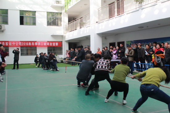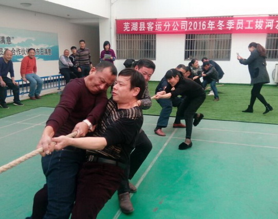 12月2日上午,安徽运泰芜湖县客运分公司二楼运动场上冬季员工拔河比赛火热进行。共有驾乘人员组、安全生产运调科组、QQ公司财务科点币室组、公营一二队组、加油站监控室机务科组、办公室稽查后勤组、客运中心组等七支代表队的63名选手参赛。比赛中选手们个个不甘示弱,咬牙坚持;场外拉拉队也倾情投入,加油声、助威声此起彼伏。经过激烈的角逐,驾乘人员组夺得第一名。赛后,大家总结出个人的力量微不足道,劲往一处使才能取得胜利。
