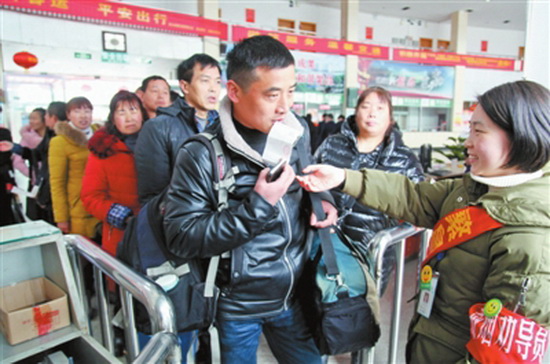 2月4日(正月初八)上午,安徽运泰繁昌公司客运站迎来节后客流高峰。该公司结合春运“暖冬行动”,围绕“青春志愿行、温暖回家路”主题,开展志愿服务活动,组织青年志愿者在站口维持秩序,帮助旅客顺利通行。(摘自2017年2月5日《大江晚报》 杨华 韩忠荣 文/摄)