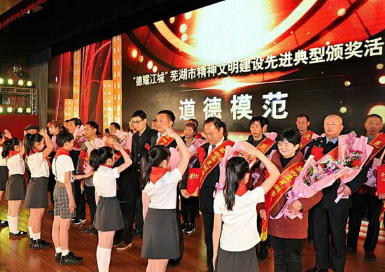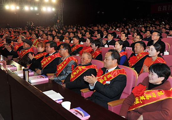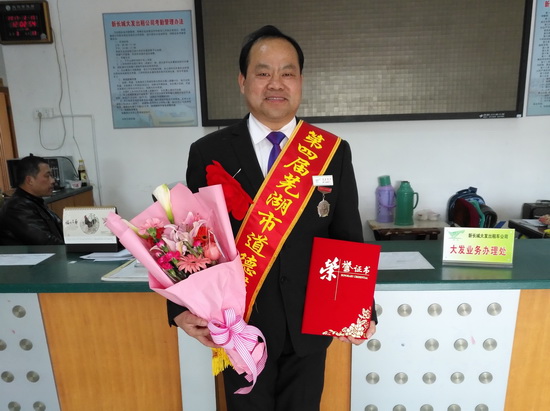 德重千金,德耀江城;城市榜样,前进动力。2月15日,我市举行“德耀江城”全市精神文明建设先进典型颁奖活动,133人获得表彰,安徽运泰新长城公司“的哥”李根银被授予市“第四届道德模范”。(杨天 文/摄)