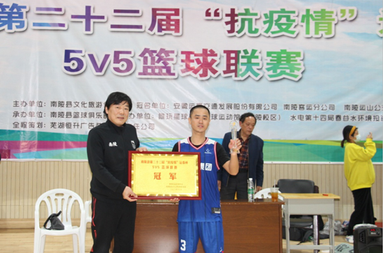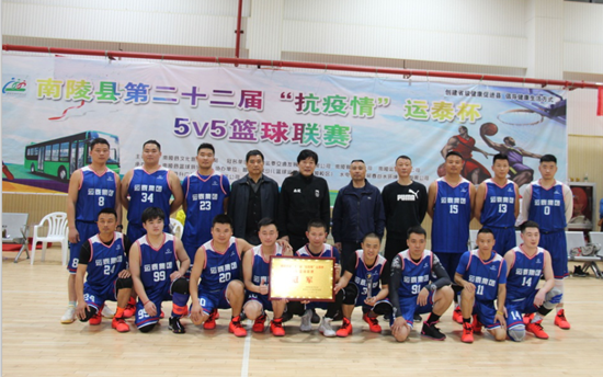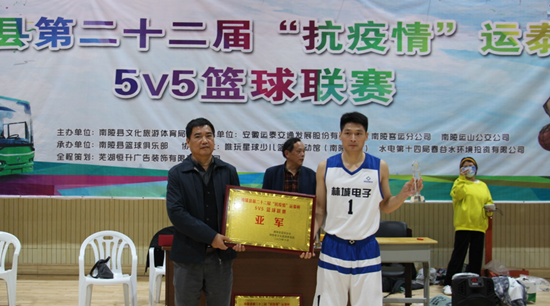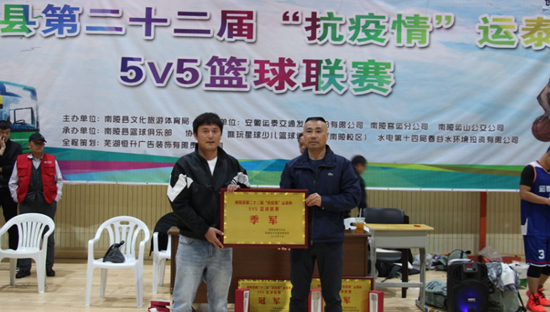 11月8日,为期70天的南陵县第二十二届“抗疫情”运泰杯男子篮球联赛鸣哨收兵。当晚,决赛在县全民健身活动中心打响,经过激烈的比拼,安徽运泰代表队战胜林城电子代表队荣获冠军。 赛后,南陵县县委常委、副县长马成名,安徽运泰党委书记叶松,运泰南陵公司经理王翔分别为冠军安徽运泰队、亚军林城电子队、季军戴公山林场队颁奖。(徐国庆 文/摄)
