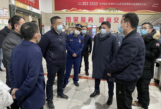 1月29日下午,市委副书记、市长宁波一行来安徽运泰芜湖汽车站检查疫情防控、低温雨雪冰冻灾害防范及春运工作。市委常委、常务副市长贺东,市政府秘书长王志鹏参加。市交通运输局、卫健委、应急管理局、城管局主要负责同志,安徽运泰常务副总经理沈洋、党委书记叶松、副总经理钱军、副总经理王胜、芜湖汽车站站长李汝福等陪同。