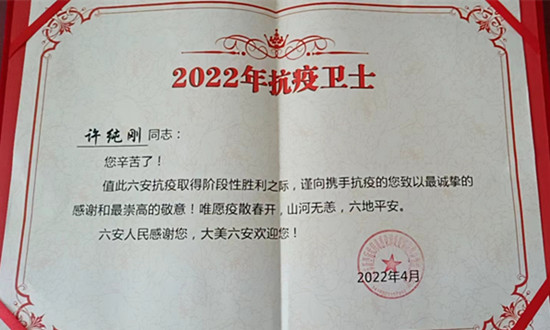 涉外公司刘登其、宋剑、冯秋平、许纯刚等4名驾驶员,自完成支援繁昌疫情防控任务后,4月9日直接从繁昌护送医护团队前往六安支援当地疫情防控工作,4月25日被授予“六安抗疫卫士”荣誉称号。(吴丹 文/摄)