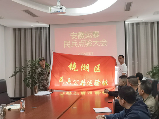 镜湖区人武部任恒部长带队来我司进行民兵整组点验,宣布成立镜湖区民兵公路运输排并对民兵点名、授旗,宣读民兵干部骨干任职命令,杨勇同志被任命为镜湖区民兵公路运输排排长。杨勇代表全体民兵发言,带领民兵宣誓:服从中国共产党领导,积极参加国家建设,忠实履行国家义务,遵纪守法,服从命令,忠于职守,努力学习,刻苦训练,随时响应国家号令,参军参战,支援前线,英勇顽强,不怕牺牲,坚决完成任务,永不背叛祖国。