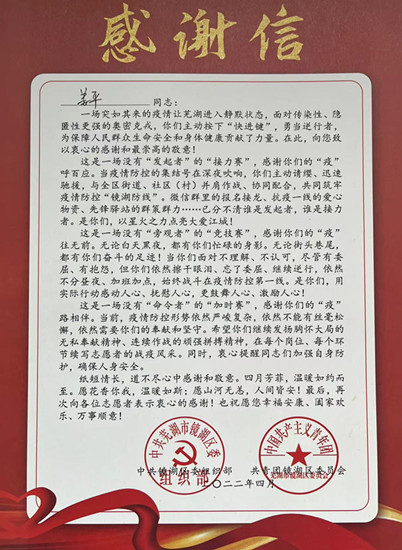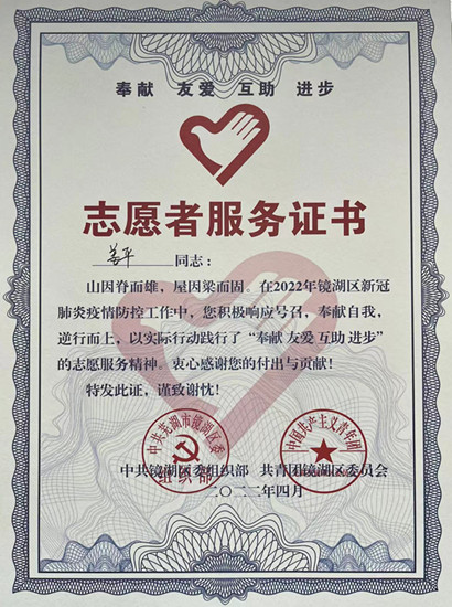 5月底,姜平收到中共镜湖区委组织部、共青团镜湖区委颁发的“志愿者服务证书”和感谢信,对她积极响应号召、奉献自我、逆行而上,以实际行动践行“奉献 友爱 互助 进步”的志愿服务精神表达感谢和褒扬。这张“志愿者服务证书”和感谢信,是对她奉献精神的肯定,是在为她的人生价值作证、为青春作证!(吴乐鹏 文/摄)