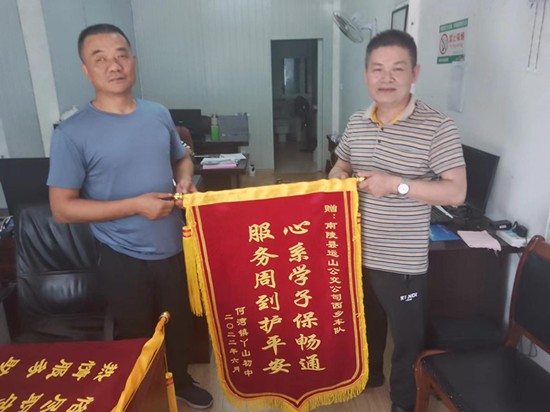 6月11日,何湾镇丫山初中和中心小学两校的负责人和教师代表专程来到芜湖运泰南陵公交公司,送来两面印有“心系学子保畅通、服务周到护平安”和“恪尽职守、保万千学子平安,热情服务、助温馨校车畅行”的锦旗,感谢南陵公交公司为山区学生上学提供的交通安全保障和良好的服务。