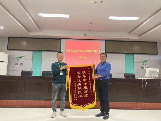 4月19日,南陵县教育局相关负责人和三里镇峨岭完小、何湾镇绿岭完小负责人给运泰南陵县校车公司赠送锦旗,感谢该公司多年来对南陵县教育工作的支持,为乡镇学生接送工作提供了“点到点”的温馨服务。(徐国庆 文/摄)